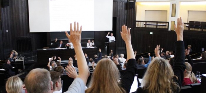 Die zweite große Frage an diesem Tag war, wie das Verhältnis zur internationalen DH Organisation ADHO aussehen soll. Zwar bietet es eine vorhandene Infrastruktur, in die man sich leicht integrieren könnte, doch die Nähe zur »Oxford University Press« wurde als problematisch empfunden. Dass die deutschsprachige DH-Community eine Idee des »Open Access« verfolgt war allgemeiner Konsens, weshalb das Verlagshaus mit seiner »Closed Access«-Strategie kritisch gesehen wurde. Doch trotz dieser Widrigkeiten waren sich alle darüber einig, dass ein Verein gegründet werden soll, der die digitalen Geisteswissenschaftler im deutschsprachigen Raum zusammenbringt. So konnte die Gründung ohne Gegenstimmen und mit nur wenigen Enthaltungen beschlossen werden.