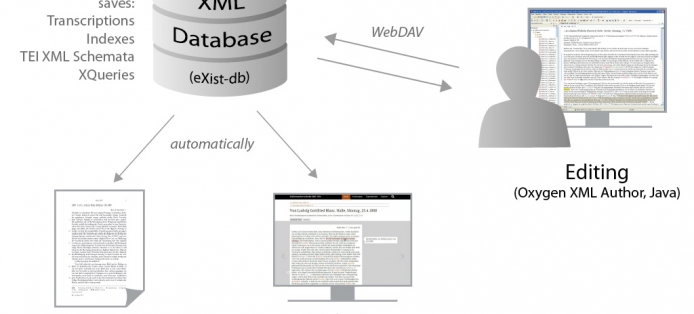 Als zentrale Softwarekomponente der neuen Arbeitsumgebung wird »Oxygen XML Author« eingesetzt. Die Bearbeiter arbeiten in Oxygen XML Author nicht in einer Codeansicht, sondern in einer benutzerfreundlichen »Autorenansicht«, die über Cascading Stylesheets (CSS) gestaltet wird. Dem Bearbeiter stehen dabei mehrere Ansichten zur Auswahl, so dass per Mausklick die für den Arbeitsschritt geeignetste ausgewählt werden kann. Außerdem kann der Endanwender über eine eigene Werkzeugleiste per Knopfdruck Auszeichnungen vornehmen. So können z.B. in Manuskripten Streichungen markiert oder Sachanmerkungen eingegeben werden. Auch Personen- oder Ortsnamen können mit der entsprechenden TEI-Auszeichnung versehen und gleichzeitig über eine komfortable Auswahlliste mit dem jeweiligen Eintrag im zentralen Personen- bzw. Ortsregister verknüpft werden. Der gesamte Text kann dadurch einfach und schnell mit TEI-konformen XML ausgezeichnet werden.