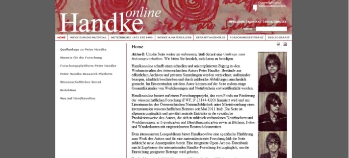 Die Website www.handkeonline.onb.ac.at schafft einen schnellen und unkomplizierten Zugang zu den Werkmaterialien des österreichischen Autors Peter Handke. Nach Art eines kommentierten digitalen Archivs werden Bestände aus öffentlichen und privaten Sammlungen verzeichnet, aufeinander bezogen, inhaltlich beschrieben und durch zahlreiche Abbildungen anschaulich gemacht. Die Seite ist frei zugänglich und bietet dem interessierten Lesepublikum eine spezifische Hinführung zum Werk des Autors und Einblicke in die ihm zugrundeliegende Arbeitsweise. Für materialzentrierte Forschungen der Literatur- und Kulturwissenschaft hält die Seite viele Ansatzpunkte bereit. Ausgewählte Werkfassungen und einige Notizbücher Peter Handkes werden als Gesamtfaksimiles erstveröffentlicht. Eine integrierte Open-Access-Plattform macht Ergebnisse der internationalen Handke-Forschung frei zugänglich.