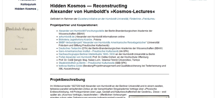 Hauptziele des Projekts »Hidden Kosmos« sind die Transkription und Annotation von bislang unveröffentlichten Nachschriften der »Kosmos-Vorträge« Humboldts, deren Verknüpfung untereinander, mit zeitgenössischen Texten Humboldts und anderer Forscher sowie schließlich auch mit zugehörigen Materialien von Humboldts Hand, die dieser sowohl für die Vorträge 1827/28 als auch als ständig erweiterte Datenbasis für den im Anschluss daran entstehenden »Kosmos – Entwurf einer physischen Weltbeschreibung« (5 Bde. 1845–1862) und weitere Publikationen verwendete.