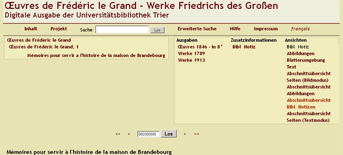 Die digitale Ausgabe der Werke Friedrichs des Großen der Universitätsbibliothek Trier bietet eine XML-konforme und recherchierbare elektronische Volltextversion der von Johann David Erdmann Preuß zwischen 1846 und 1856 herausgegeben Werkausgabe sowie der von Reinhold Koser begründeten Ausgabe der Politischen Correspondenz Friedrichs des Großen der Jahre 1740-1782. Als Textgrundlage dienten die in der Königlichen Druckerei von Decker zu Berlin gedruckte 30bändige Folio-Ausgabe der Œuvres de Frédéric le Grand und die 1879-1939 bei Duncker in Berlin erschienenen 46 Bände der Politischen Correspondenz. Weitere Briefe Friedrichs des Großen aus öffentlichem Besitz und aus dem Antiquariatshandel sind mit Angabe von Adressat, Ausstellungsort und Datum nachgewiesen und recherchierbar gemacht. Neben dem französischen Originaltext der Werkausgabe werden mehrere deutsche Übersetzungen als Faksimile oder durchsuchbarer Volltext angeboten. Die französische Originalausgabe und die Übersetzungen sind auf Kapitelebene miteinander vernetzt, so dass ein direktes Navigieren von einer französischen Textpassage zur entsprechenden deutschen und umgekehrt möglich ist. Wichtige Hilfstexte der Friedrich-Forschung wie Franz Kuglers Biographie mit Adolf Menzels Illustrationen oder Karl Heinrich Siegfried Rödenbecks Chronologie wurden ebenfalls als durchsuchbarer Volltext eingebunden. Sämtliche Abbildungen aus den digitalisierten Werken wurden inhaltlich erschlossen und können über Stich- und Schlagwörter durchsucht werden. Weitere in digitaler Form verfügbare Texte von und über Friedrich den Großen werden in einer Online-Bibliographie nachgewiesen. Neuere Editionen und Forschungsergebnisse finden in erläuternden bibliographischen Notizen Berücksichtigung.