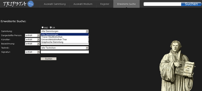 In einem ersten Schritt wurde der Zettelkatalog der ca. 5000 Blätter umfassenden Porträtsammlung der Stadtbibliothek Trier digitalisiert. Dieser verzeichnet Porträts vom 15. bis zum frühen 20. Jahrhundert in nahezu allen grafischen Techniken (Holzschnitt, Kupferstich, Radierung, Lithographie, Holzstich, Stahlstich u.a.m.) in unterschiedlicher Erschließungstiefe und Qualität. Eine einheitliche formale Anordnung der Beschreibungselemente, die eine automatisierte maschinelle Weiterverarbeitung der mit einem OCR-Programm erkannten Textdaten erlaubt hätte, lag nicht vor. Sowohl die Namensansetzungen für die dargestellten Personen als auch die der ausführenden Künstler waren uneinheitlich und bedurften der Überprüfung und Korrektur. Aus den heterogenen Beschreibungselementen* konnten ohne Autopsie der Originale zunächst lediglich die elementaren Angaben zu den dargestellten Personen, den ausführenden Künstlerinnen und Künstlern und die Signaturen übernommen werden. Alle Personenangaben wurden anhand von Normdateien (ALK, PND, WBIS, SWD, Wikipedia) überprüft und im Hinblick auf eine konsistente Suche normiert. Bis zum Abschluss der Digitalisierung der Originalgraphiken aus dieser Sammlung werden in Tripota anstelle der Bilder lediglich Scans der zu den entsprechenden Treffern gehörenden Katalogzettel angezeigt. Die Scans der ca 5000 Porträts aus der Porträtsammlung der Stadtbibliothek Trier sollen Ende 2011 in Gänze zur Verfügung stehen.