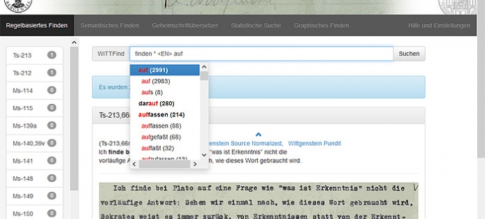 Since 2010 the Wittgenstein Archives at the University of Bergen (WAB) and the Center for Information and Language Processing at the University of Munich (CIS) cooperate in the research group “Wittgenstein in Co-Text”. The group developed the web-based FinderApp WiTTFind (see: http://wittfind.cis.uni-muenchen.de) and the “Wittgenstein Advanced Search Tools” (WAST). WiTTFind is a new kind of search machine, which uses rule-based technologies in combination with electronic lexica and various computational tools. It allows queries to WAB’s XML-TEI(P5) transcriptions of Ludwig Wittgenstein’s philosophical Nachlass, including queries based on word forms and syntactic, semantic and sentence structure specifications. The hits of our FinderApp are displayed as HTML outputs as well as highlighted in the facsimiles.