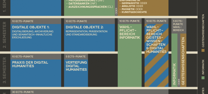 Der bilinguale (Deutsch – English) Studiengang erstreckt sich über 2 Jahre und wird als Kernfachmaster ohne verpflichtende Nebenfächer angeboten. Der Studiengang besteht aus einer Orientierungsphase (1–2 Semester), in der fehlende Grundlagen im Bereich Informatik oder Geisteswissenschaften (in Abhängigkeit vom jeweiligen Bachelor-Studium) erworben werden. Im weiteren Verlauf werden Kernkompetenzen in den Digital Humanities vermittelt und durch Wahlpflichtoptionen in den Bereichen Informatik und Geisteswissenschaften ergänzt. Der Studiengang enthält zudem eine Praxiskomponente. EEine ausführliche Beschreibung des Studiengangsaufbaus findet Sie hier.